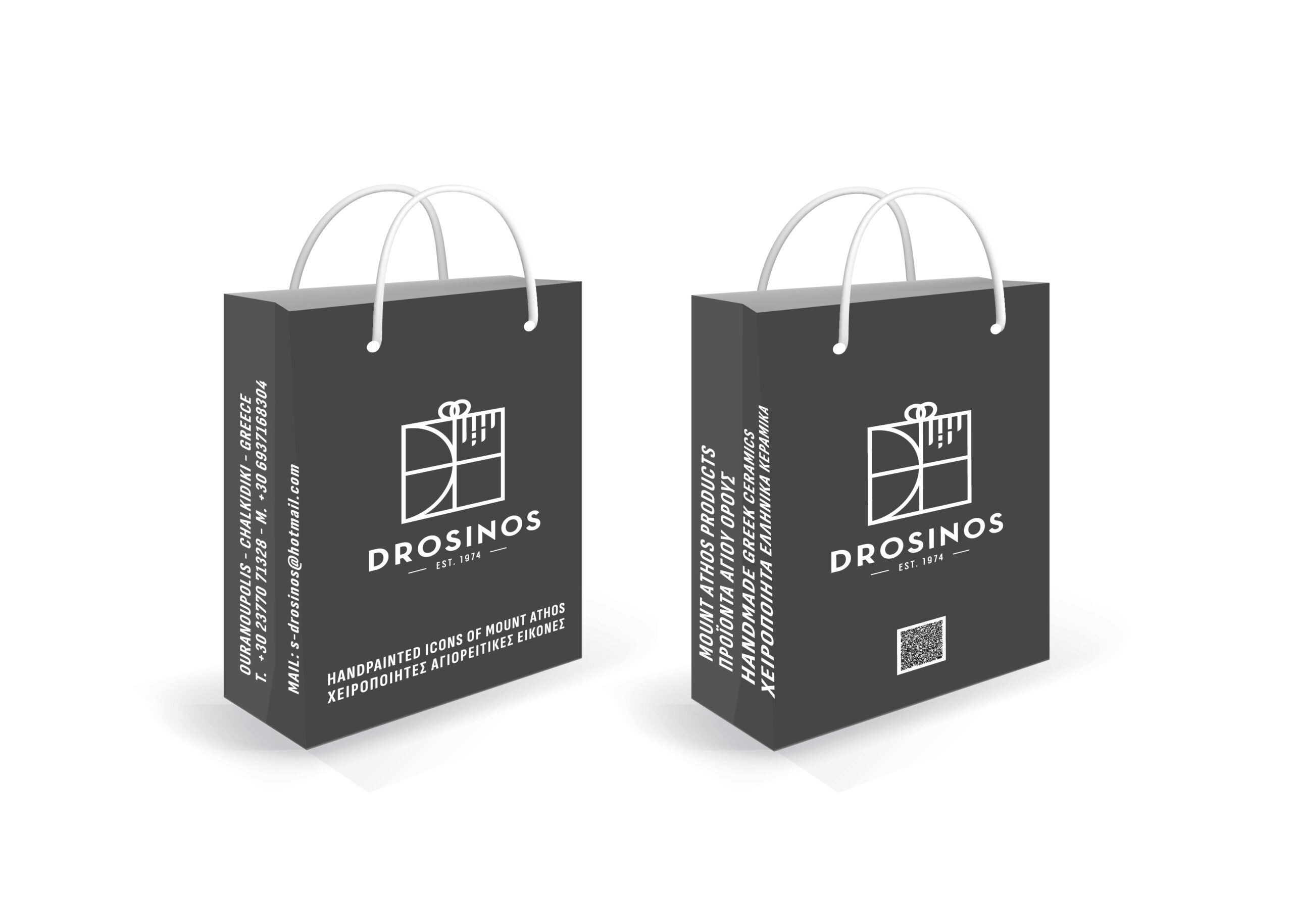 Σχεδιασμός Λογοτύπου και ανάπτυξη εφορμογών σε χάρτινες τσάντες για το κατάστημα χειροποίητων Αγιορειτικών εικόνων και δώρων DROSINOS στην Ουρανούπολη Χαλκιδικής, την πύλη του Αγίου Όρους. Μίνιμαλ χαρακτηριστικά σχεδίασης, λιτή ασπρόμαυρη παλέτα χρωμάτων!